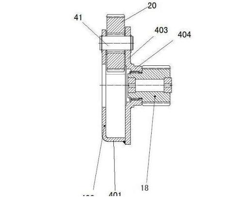 由于各级行星轮系传动机构的结构相同,以第一级行星轮系传动机构为例进行介绍,第一级行星架 3 是由中空的轮架外壳 40 和固定于轮架外壳 40中的沿圆周均匀分布的三个行星轮轴 41 构成,所述轮架外壳 40 包括环筒状的周壁 401 和固连于周壁 401 前后端面的前端壁 402、后端壁 403,前端壁 402 开设有供输入装置插配的中心孔,后端壁 403 开设有中心孔并在中心孔上向外轴向延伸设有与第二级太阳轮 18 通过花键传动配合的内花键套 404。所述行星轮轴 41 的前后两端分别插配于轮架外壳 40 前、后端壁上对应开设的安装孔并通过卡簧固定,各个第一级行星轮 20 通过轴承转动装配于各对应的行星轮轴 41 上。所述周壁 401 上开设有三个供各个行星轮的远离中心的轮体探出周壁 401 之外的通孔 405。通过该通孔 405 使得各第一级行星轮 20 得以与对应的第一级内齿圈 5 啮合。